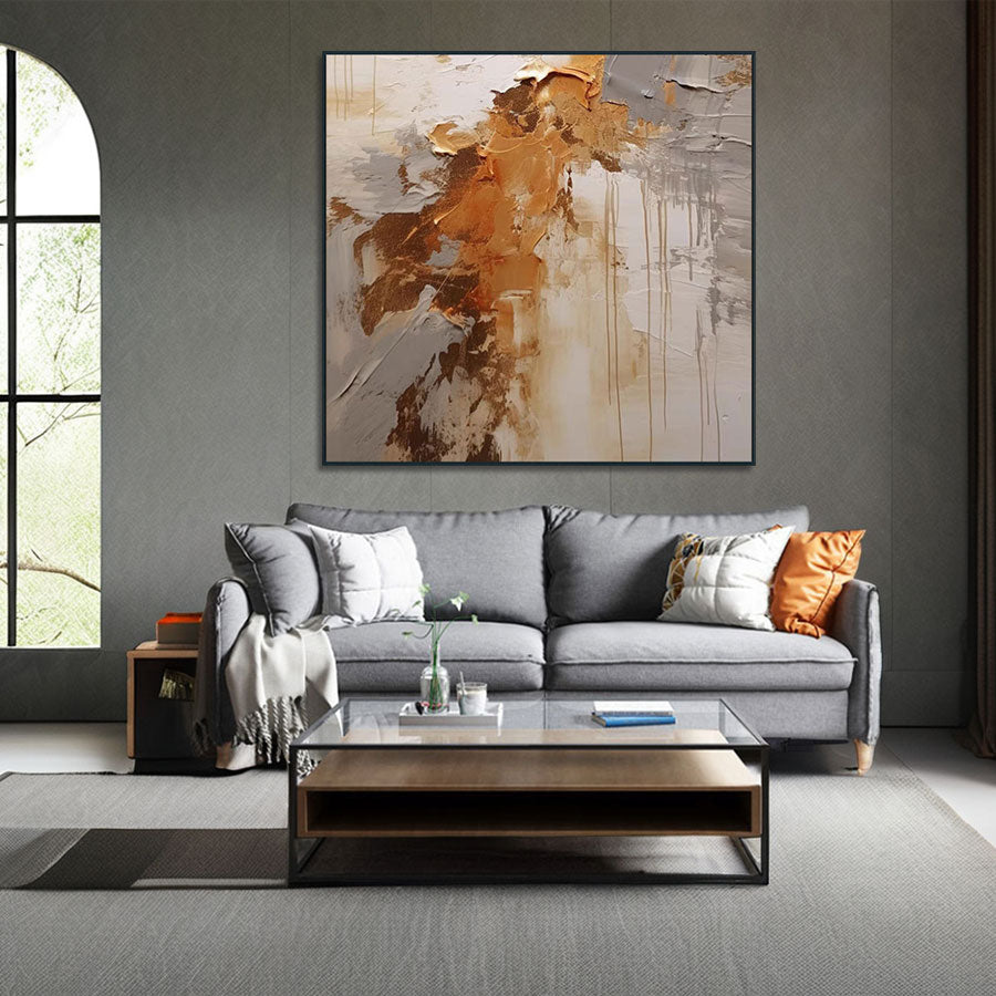 Infuse your space with dramatic, earthy elegance with this 100% hand-painted oil original. The square canvas features bold, heavy impasto texture in rich tones of rust, warm beige, and cool grey.