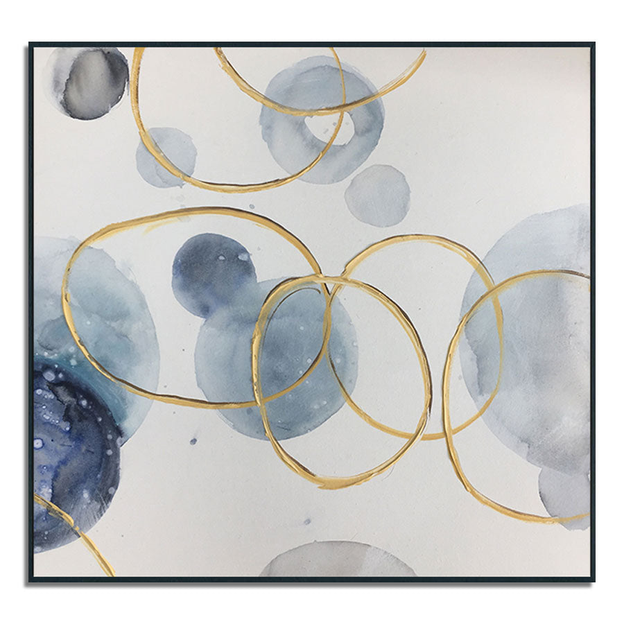 Infuse your space with delicate luxury and grace with this 100% hand-painted oil original. The square canvas features soft, watercolour-style blue and grey washes overlaid with elegant, shimmering rings of textured metallic gold.